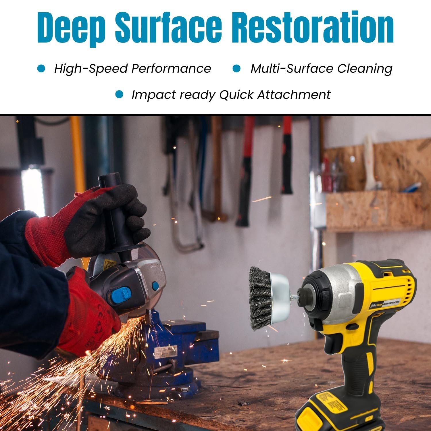 Universal 1/4" Hex Shank for Drill or Impact: features mounted 1/4-inch hex shanks for a firm, no-slip grip, ensuring compatibility with most drills and impact drivers for efficient metal surface cleaning.