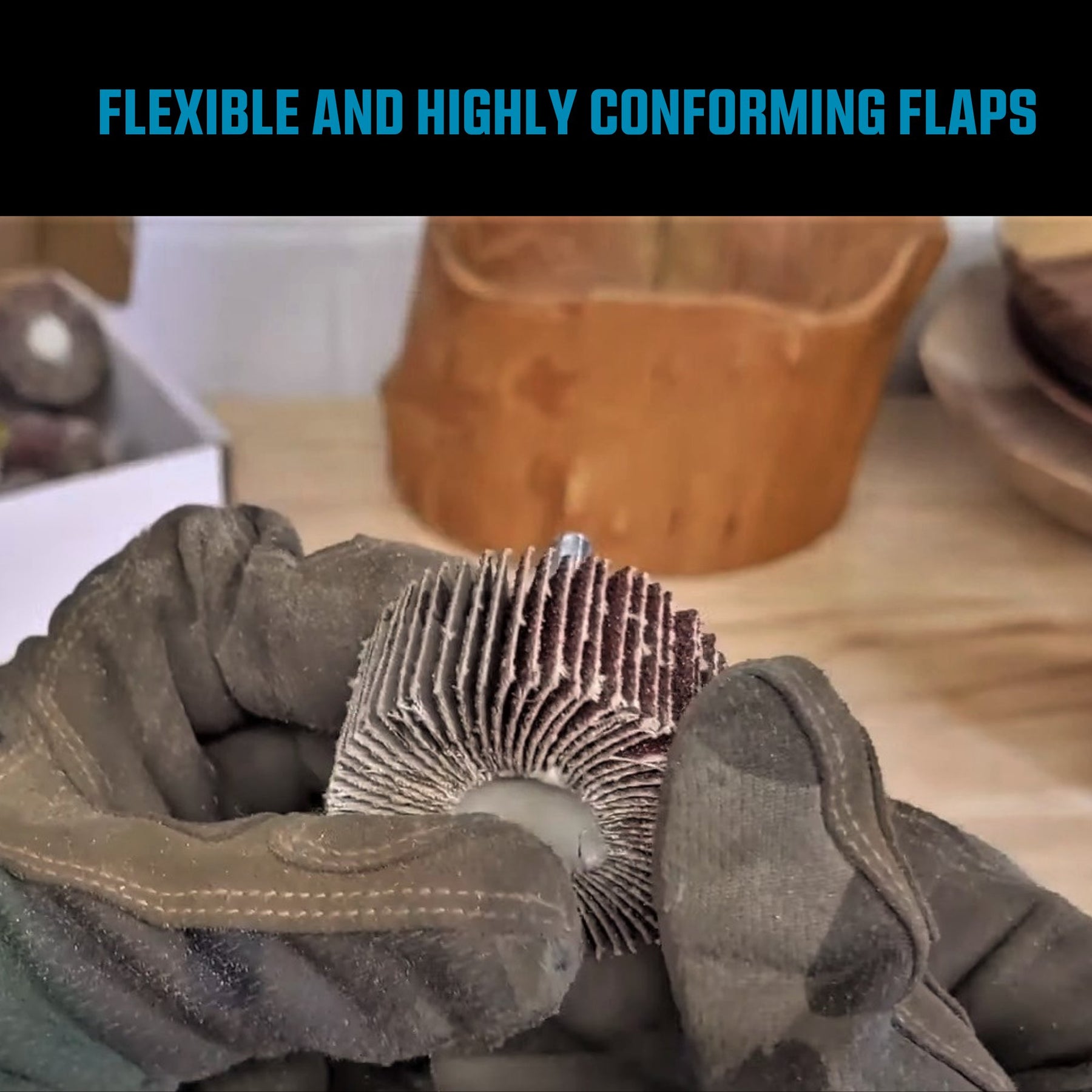 The round design of the flap sanding wheels allows them to easily reach into corners, curved surfaces, and round profiles, making them well-suited for sanding intricate shapes or smoothing out contoured edges.
