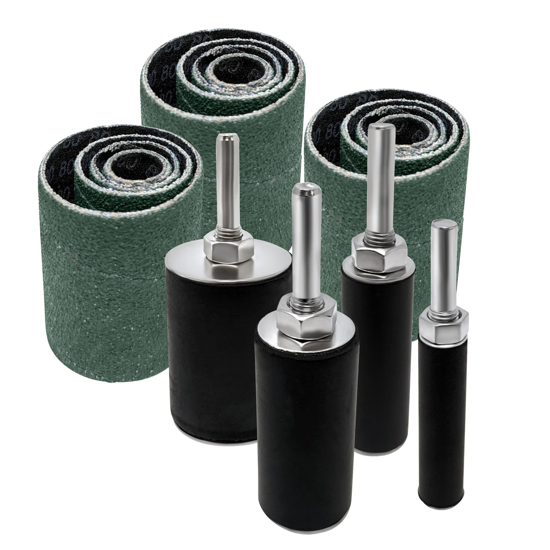 Ensemble de ponçage à tambour en caoutchouc extra long avec chaque tambour monté sur une tige de 1/4 de pouce qui convertit votre perceuse ou perceuse à colonne en mini ponceuse à broche