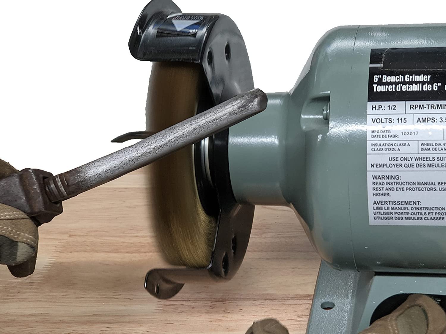 Transform your ordinary bench grinder into a stationary wire brush station, 5/8 inch arbor hole fits most 6 inch bench grinder, comes with 1/2 inch bushing to adapt for 1/2 inch arbor grinders. With a diameter of 6 inches and a 1/2 inch thickness this wire wheel brush can be very useful around the shop