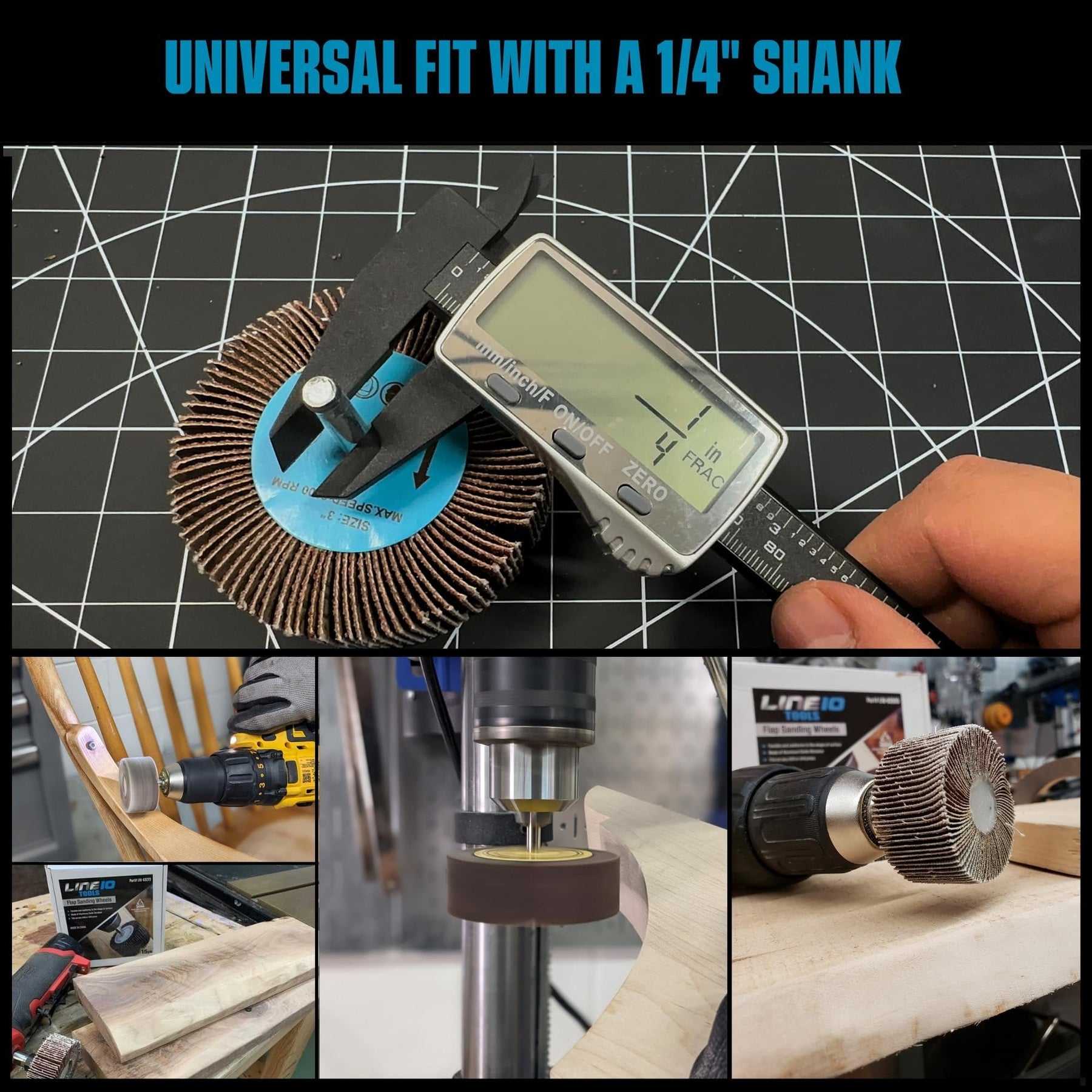 The flap sanding wheels are mounted on a universal 1/4 inch round shank, which allows you to mount your sander onto any drill for ultimate portability or drill press for superior control, which allows you to sand and smoothen round surfaces in your project, such as concaves and inside holes and other hard to get to areas.