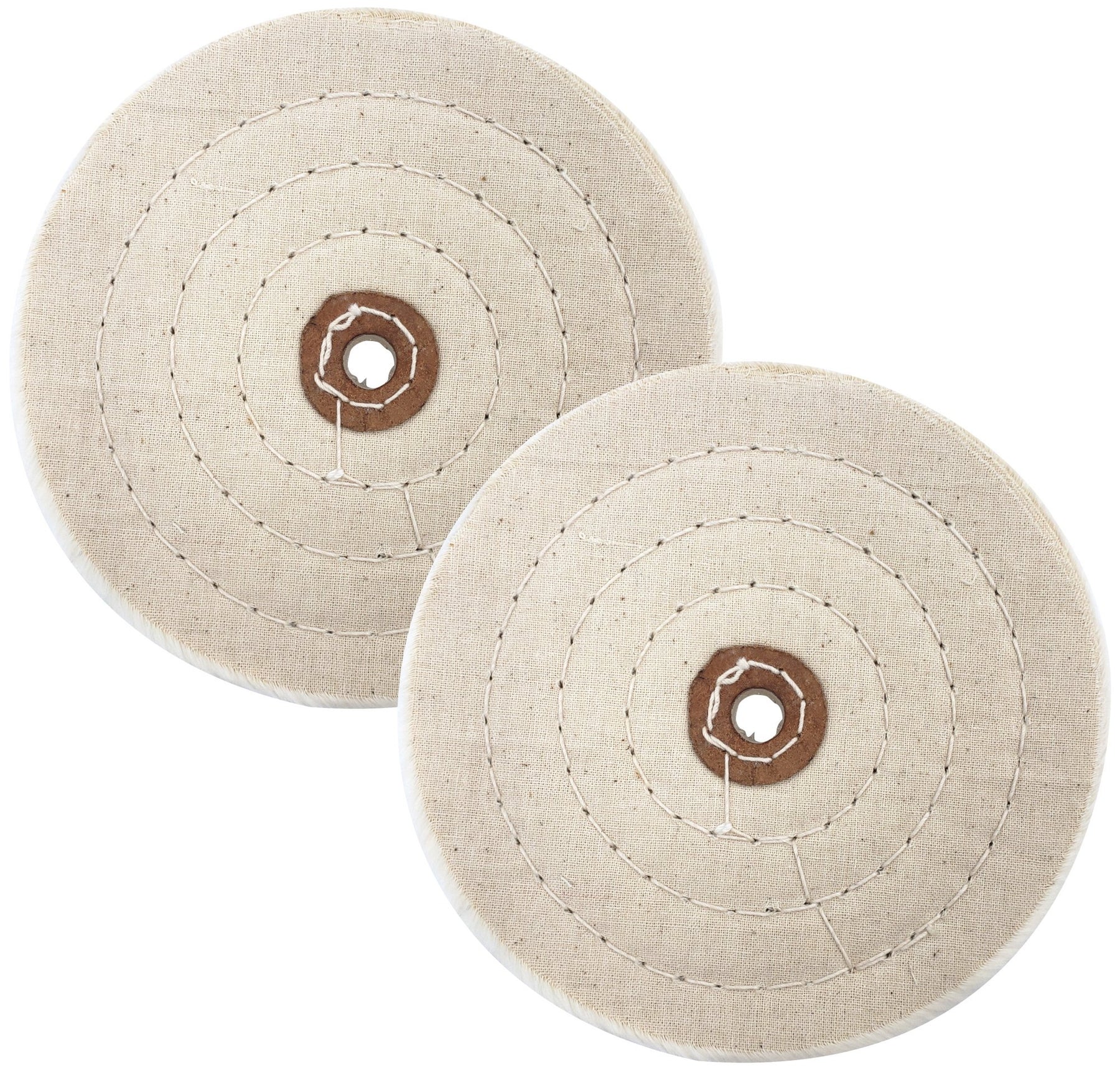 The package includes two-pack spiral sewen cotton buffing wheels, 6 inches in diameter, and features a 1/2 inch arbor hole, leather lines to withstand wear and tear, can be used with 1/2 inch arbor bench grinders or buffing machines.