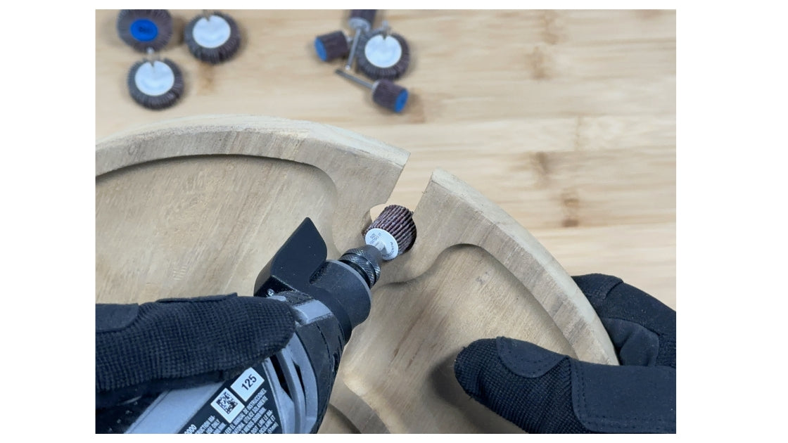 Work with precision to smoothen hard to reach areas, as this wheel can get small and tight spaces in your project, quickly and with precision. The round shape allows you to get into crevices and sand right angles edges, and round areas such as contours the inside of holes as well.